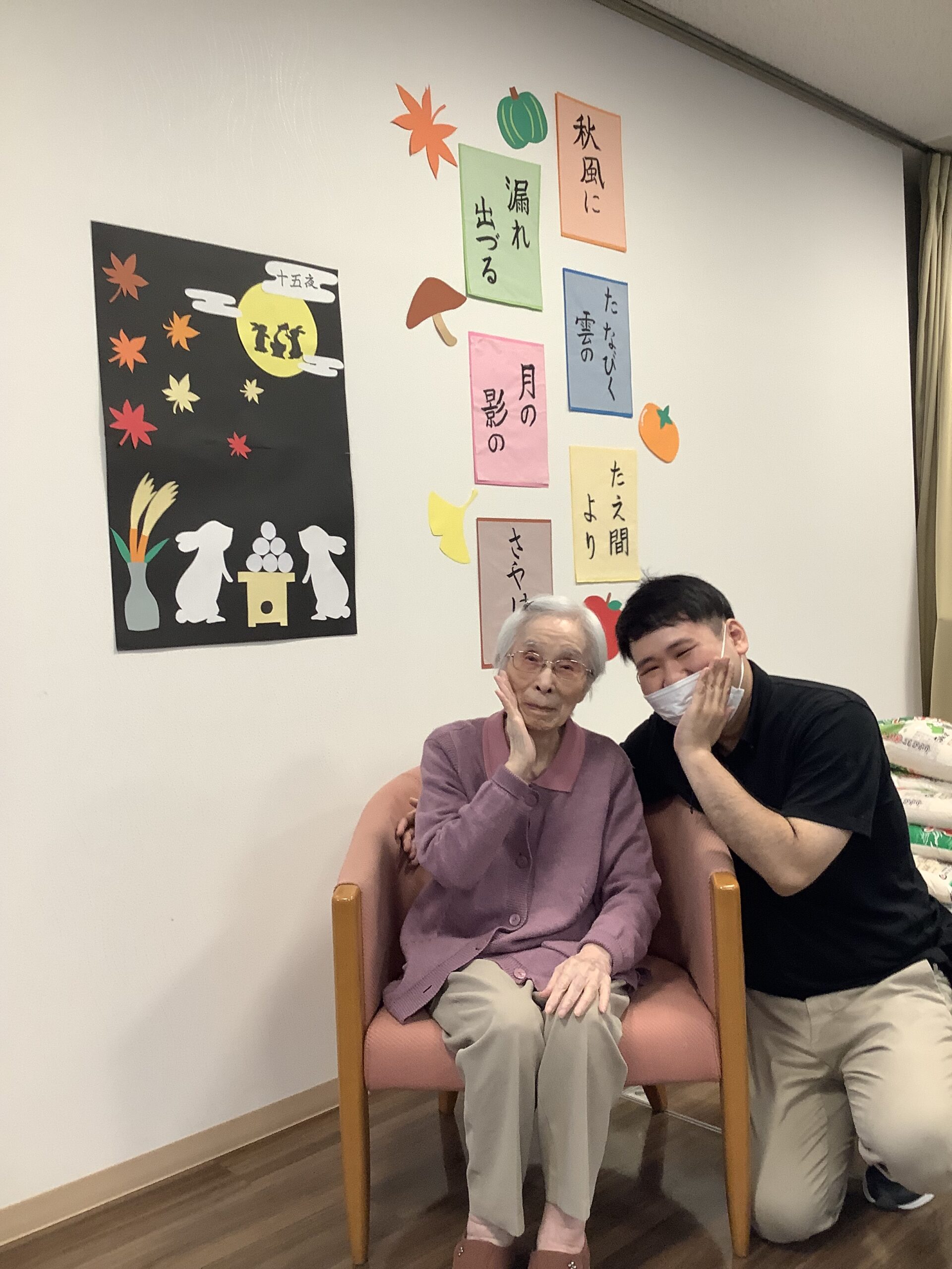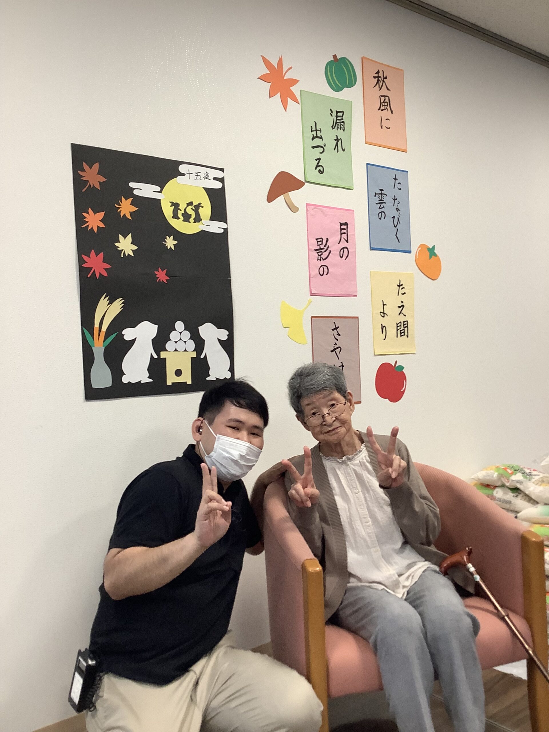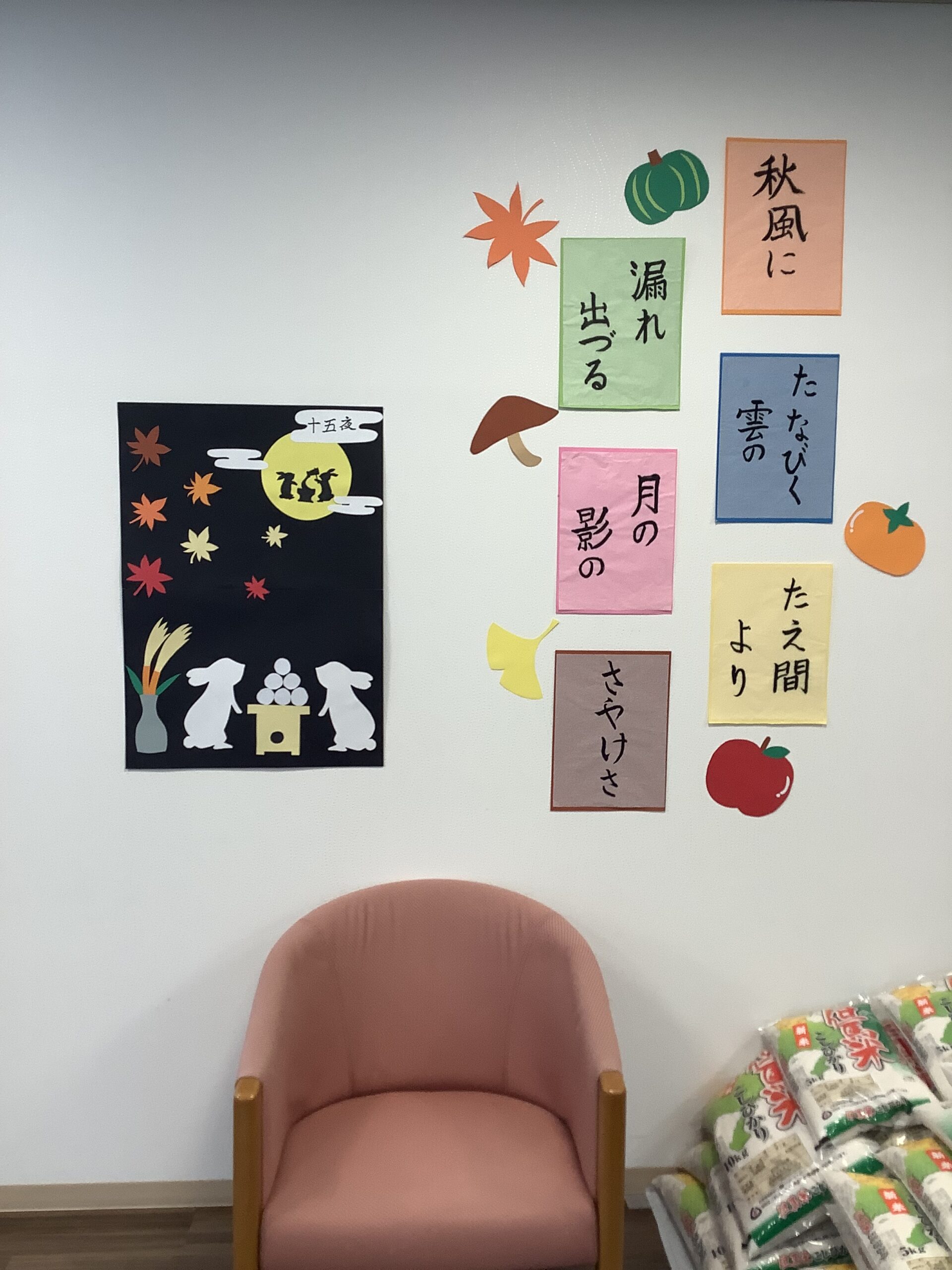 今回は、壁面をお月見にし、入居者様に百人一首の秋の句を書にしたためていただきました。