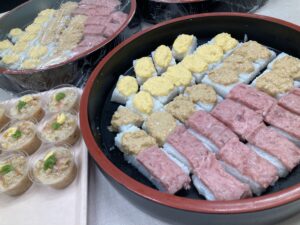 マグロやサーモン、エビにいなり寿司、食べやすいように柔らか寿司を提供。