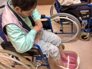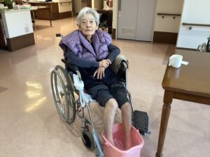 足元から温まっていただこうと3花ユニットでは足浴を行いました。