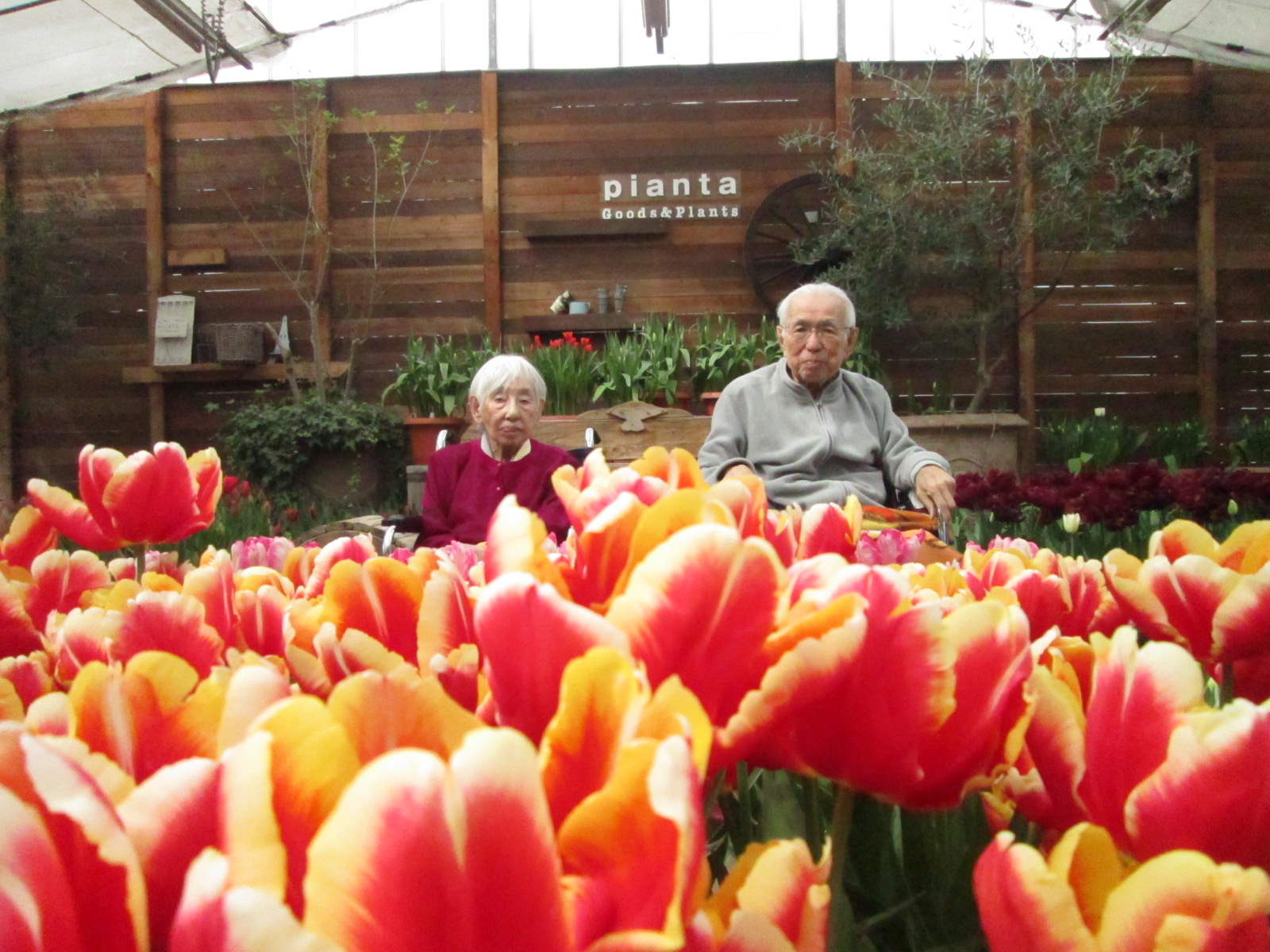 到着し、少しお散歩し温室内できれいなチューリップと記念撮影をしました。