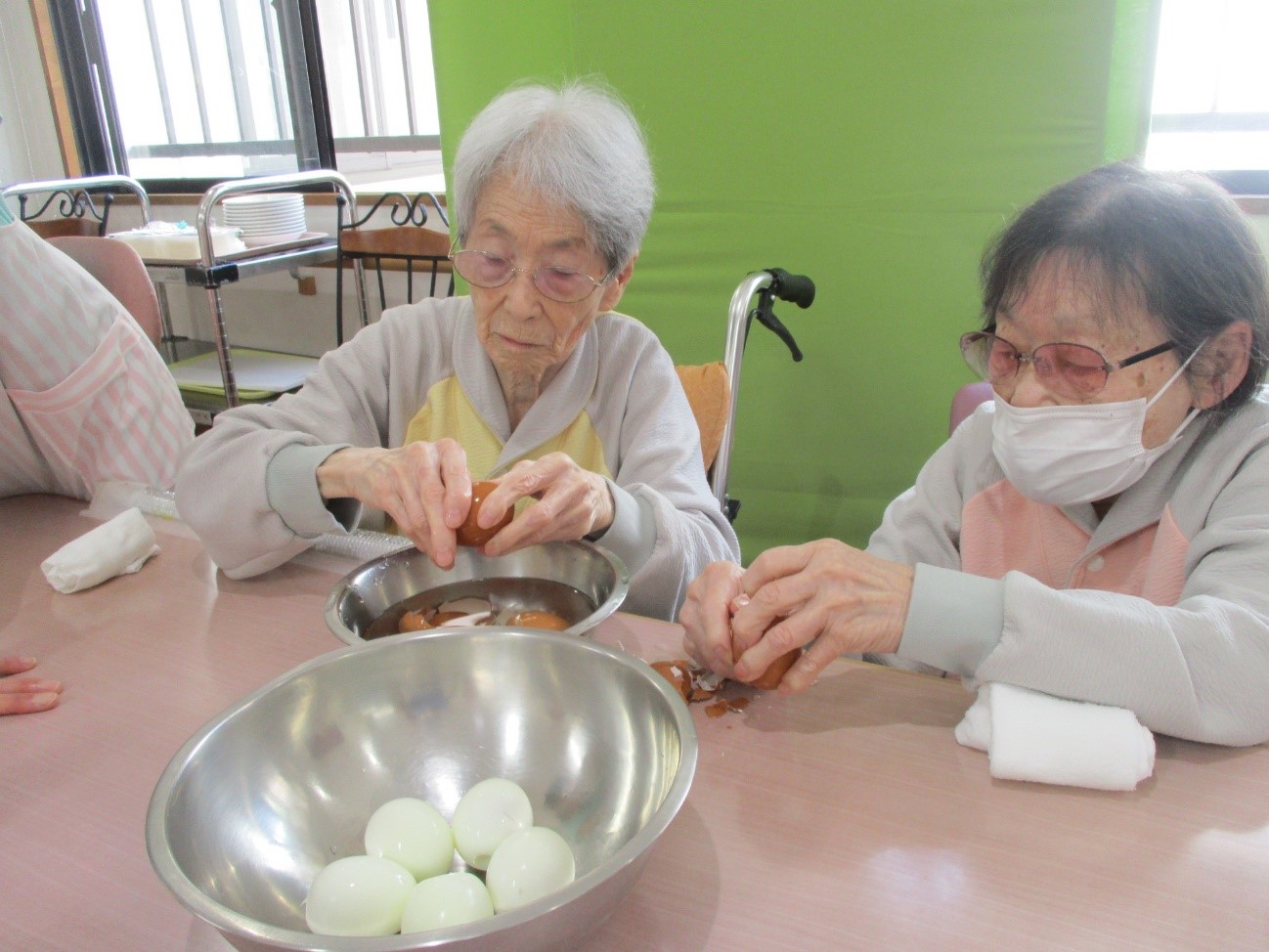 これが意外と難しく「つるつる滑る!」「卵が逃げて難しいわ」と苦戦しながらも、細かい状態にしてくださいます。