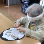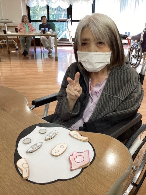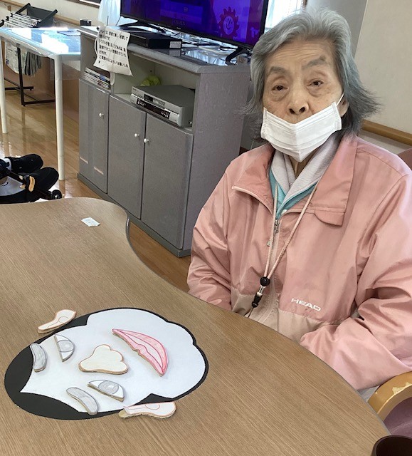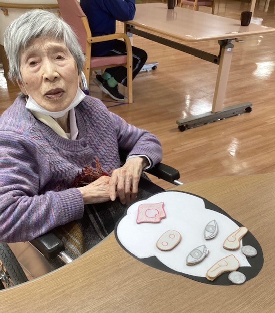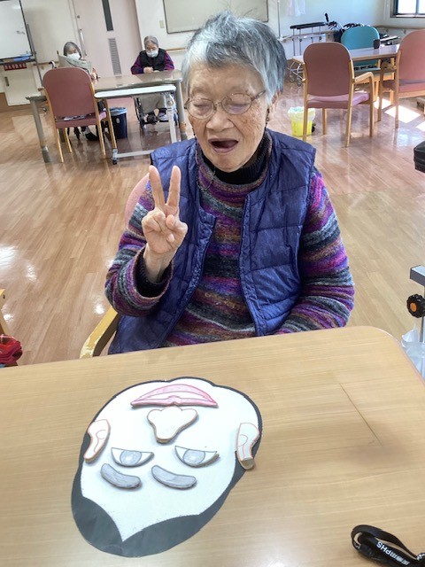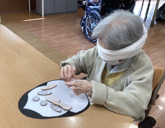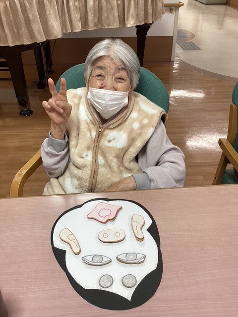 お正月ならではの遊びに、 皆さま目や鼻、口のパーツを一つずつ置きながら、 真剣な表情で取り組まれます。
