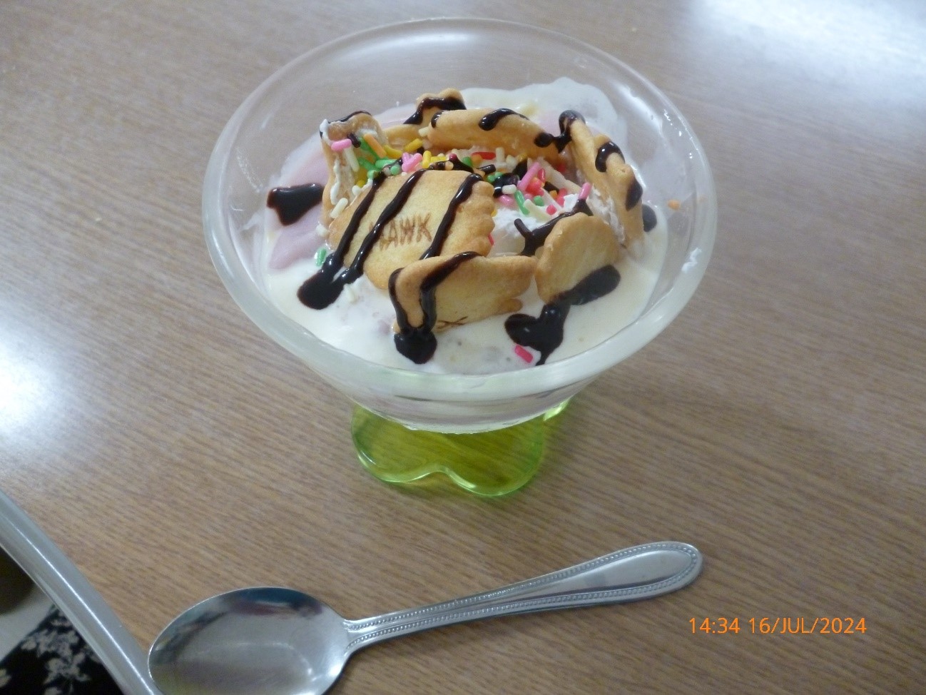 →アイスをのせホイップクリームやクッキーで飾り付け、こちらをみなさまに