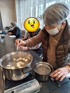 丸めたら茹でます。「次の(団子)入れるから、かして。」