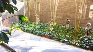 大きな窓から見える中庭には