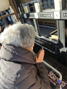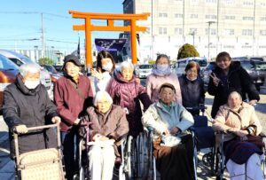 晴れやかな空の下、利用者の皆さんは笑顔で境内を歩き、