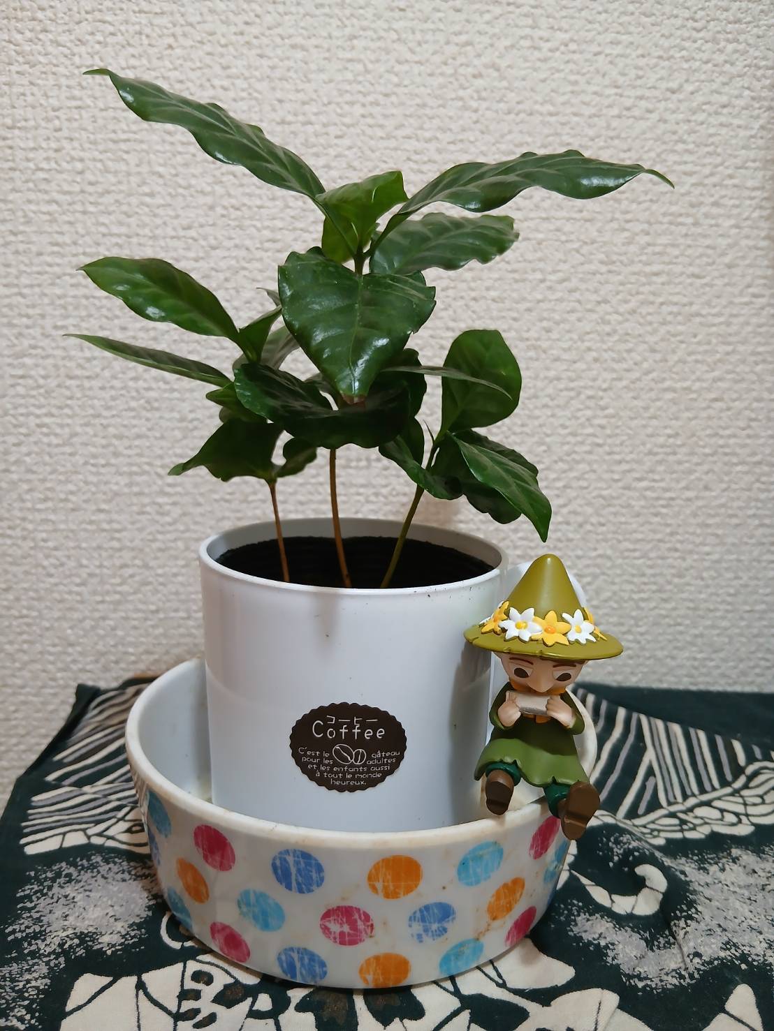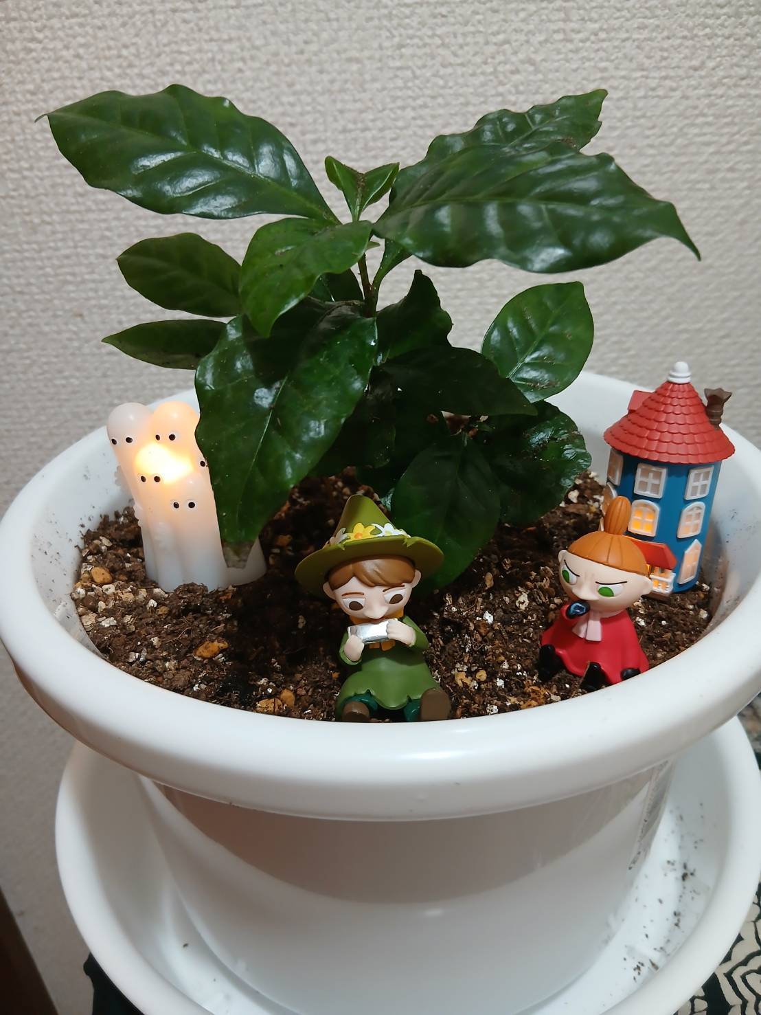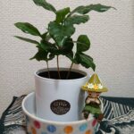 コーヒーの木・・・ 7日ほどすると大きくなりましたので コーナンで観葉植物の土と、植木鉢を買いました。 植え替えました! 飼い猫が居なくなりさみしい日々でしたが、 良き友ができました!!