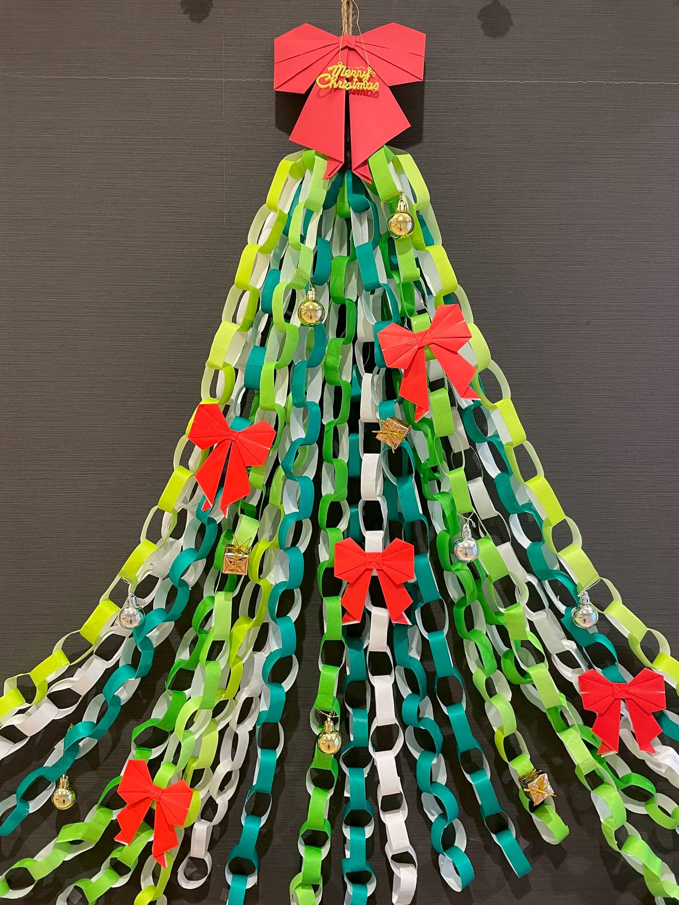 飾り付けに、繋いだ輪っか飾りを一点にまとめ放射線状に広げて、