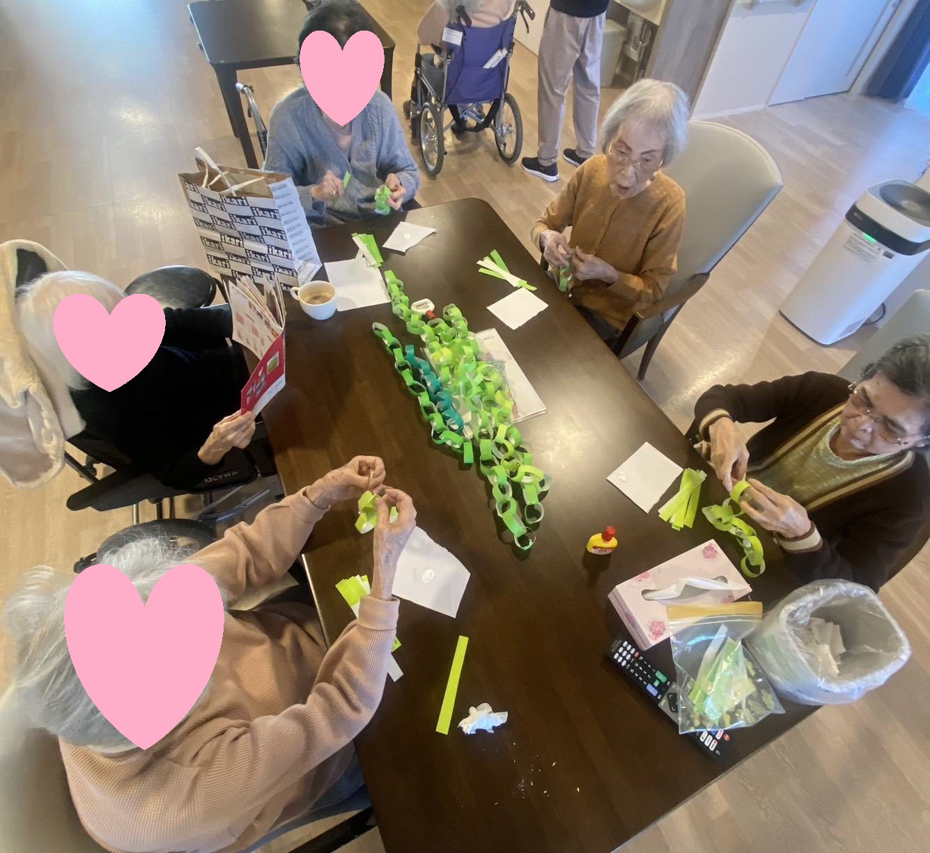 入居者様にグリーンやホワイトの折り紙で、
